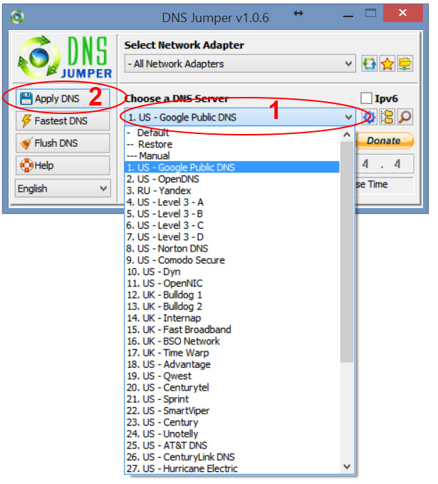 1. Lalu setting program DNS jumper anda dengan memilih DNS server ke 1.US Google Public DNS seperti gambar dibawah